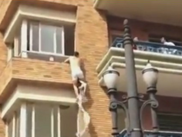 જો કે, ત્રીજામાળેથી કૂદવુ ખતરાથી ખાલી નહી હોય તેણે કપડાંનો ઉપયોગ કરીને જેમ-તેમ કરીને પહેલા માળે પહોંચી ગયો હતો. એ સમયગાળામાં નીચે એકઠાં થઇને આ પતિ-પત્ની અને વોનો તમાસો જોઇ રહેલા લોકોમાંથી કોઇકે ઇમરજન્સી સેવાને ફોન કરી દેતા ઇમરજન્સી સેવાએ નીચે ગાદલા બીછાવીને પહેલામાળે સલવાયેલા પ્રેમીને કૂદી જવા કહ્યું હતું. જો કે, નીચે આવી ગયા પછી પણ તેનો રૂઆબ જોવાલાયક હતો. અહીં નીચે સ્લાઇડરમાં પતિ- પત્ની અને વોની તસવીરો અને વીડિયો રજૂ કરવામાં આવ્યો છે.
