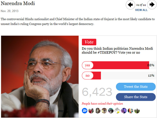 'પર્સન ઓફ ધ યર'ની પસંદગી જોકે ટાઇમના તંત્રીઓ દ્વારા કરવામાં આવે છે પરંતુ આમાં વાચકોને પણ પોતાનો મત આપવાનું કહેવામાં આવ્યું છે. આ વર્ષે સૌથી વધારે ચર્ચામાં રહેલી વ્યક્તિ પર પસંદગીની મહોર મારવામાં આવશે. અત્યાર સુધી નરેન્દ્ર મોદીને 16,122 વોટ મળી ચૂક્યા છે અને નરેન્દ્ર મોદી લીડર બોર્ડ પર 5.8 ટકા મત સાથે બીજા નંબર પર આવી ગયા છે. મોદી સવારથી લીડ કરી રહ્યા હતા પરંતુ એનએસએના લીકર એડવર્ડ સ્નોડેને 225,639 મત મેળવીને મોદીને પાછળ કરી દીધા છે. નરેન્દ્ર મોદીને વોટિંગ કરવા માટે અહીં ક્લિક કરો