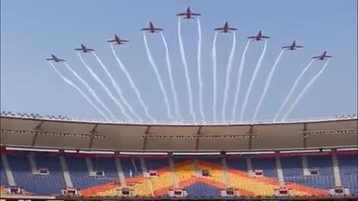 Air show by @Suryakiran_IAF at Narendra Modi Stadium, Ahmedabad 📍 pic.twitter.com/6H4hEkIpC1