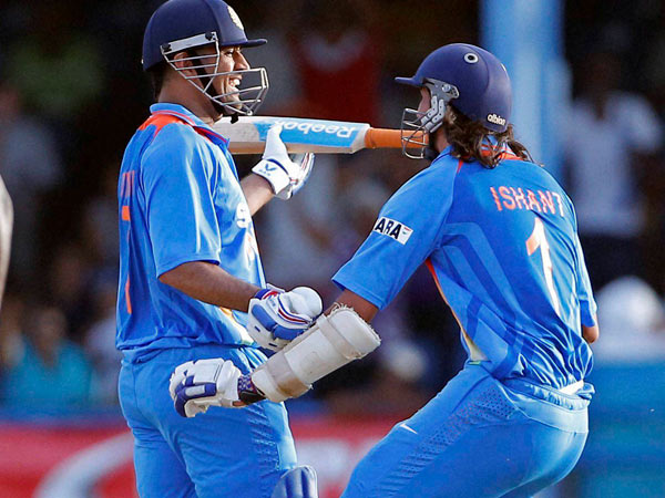 શ્રીલંકાને ફાઇનલમાં હરાવીને ફરીથી ચેમ્પિયન સાબિત થયેલી ટીમ ઇન્ડિયા. વિજયી સ્ટ્રોક ફટકાર્યા બાદ ઇશાંત શર્મા સાથે જીતની ખુશી વ્યક્ત કરી રહેલો ભારતીય સુકાની મહેન્દ્ર સિંહ ધોની.