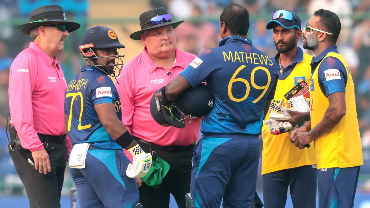 મેથ્યુઝે હેલ્મેટ રિપેર કરવાનો પ્રયાસ કરતા તેની પટ્ટી તૂટી ગઈ. આ પછી નવા હેલ્મેટનો ઓર્ડર આપ્યો. ત્યારબાદ બોલિંગ કરી રહેલા શાકિબ અલ હસને અપીલ કરી અને અમ્પાયરે તેને આઉટ આપ્યો.